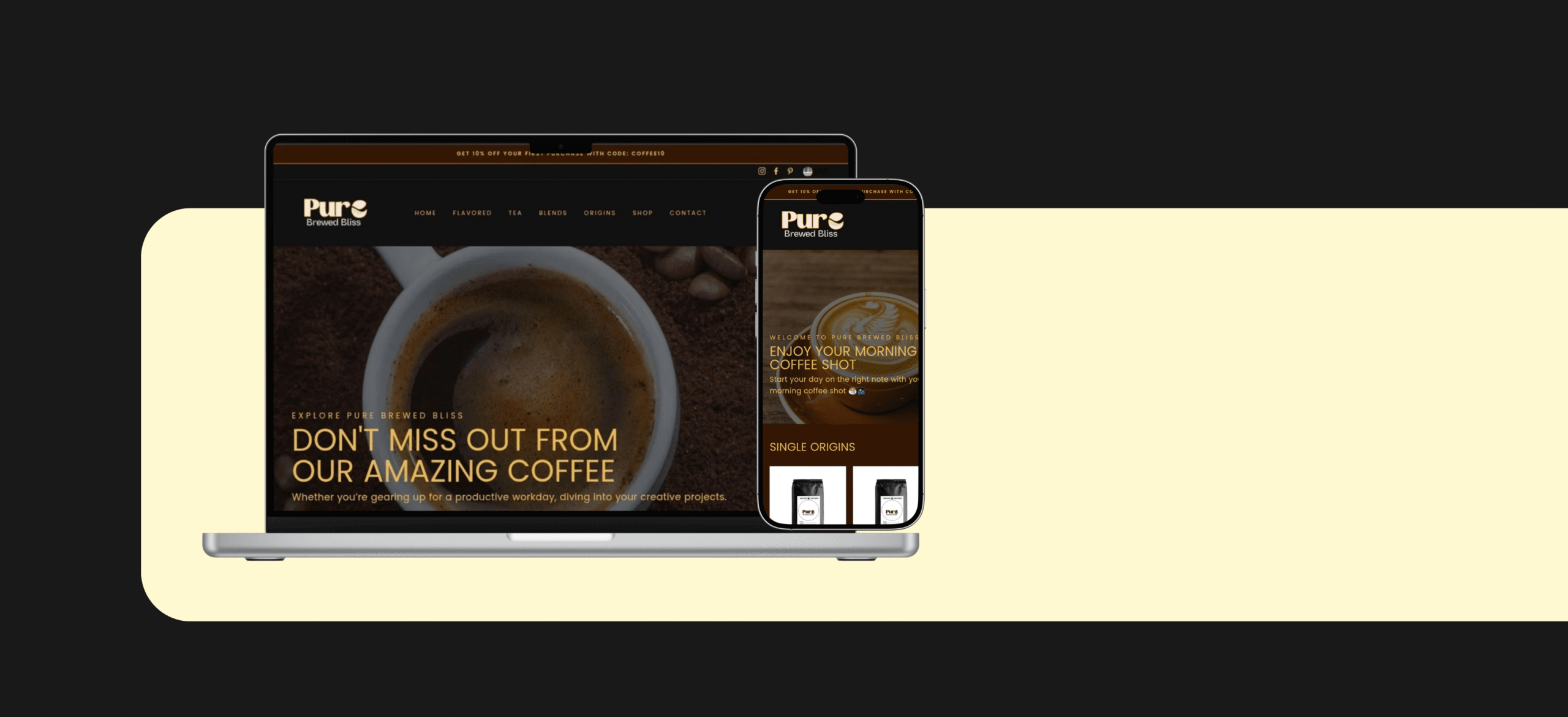 The website is built with a warm, inviting design that complements the brand’s commitment to delivering bliss in every sip. It tells the story of Pure Brewed Bliss, showcasing how each blend is carefully curated and crafted. The design includes beautiful, high-quality visuals that immerse visitors in the world of coffee while providing them with a smooth, easy shopping experience.